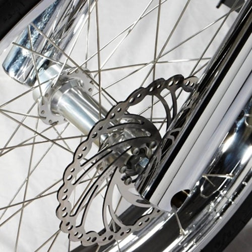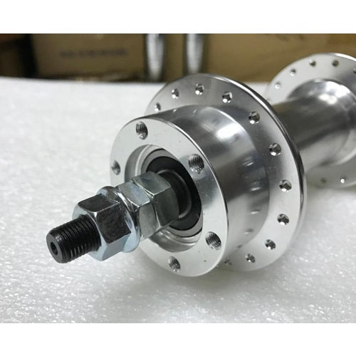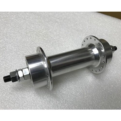 Alloy hub with adapter for brake disc. Custom built with sealed bearings and beautiful finish. Can be adapted for rear wheel with a freewheel.